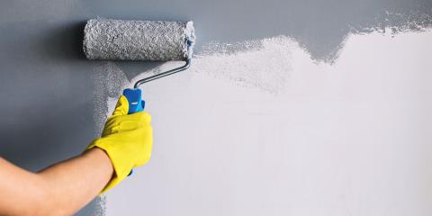 • Close-up of adult painting wall with bright blue paint. Hand using roller for renovation work